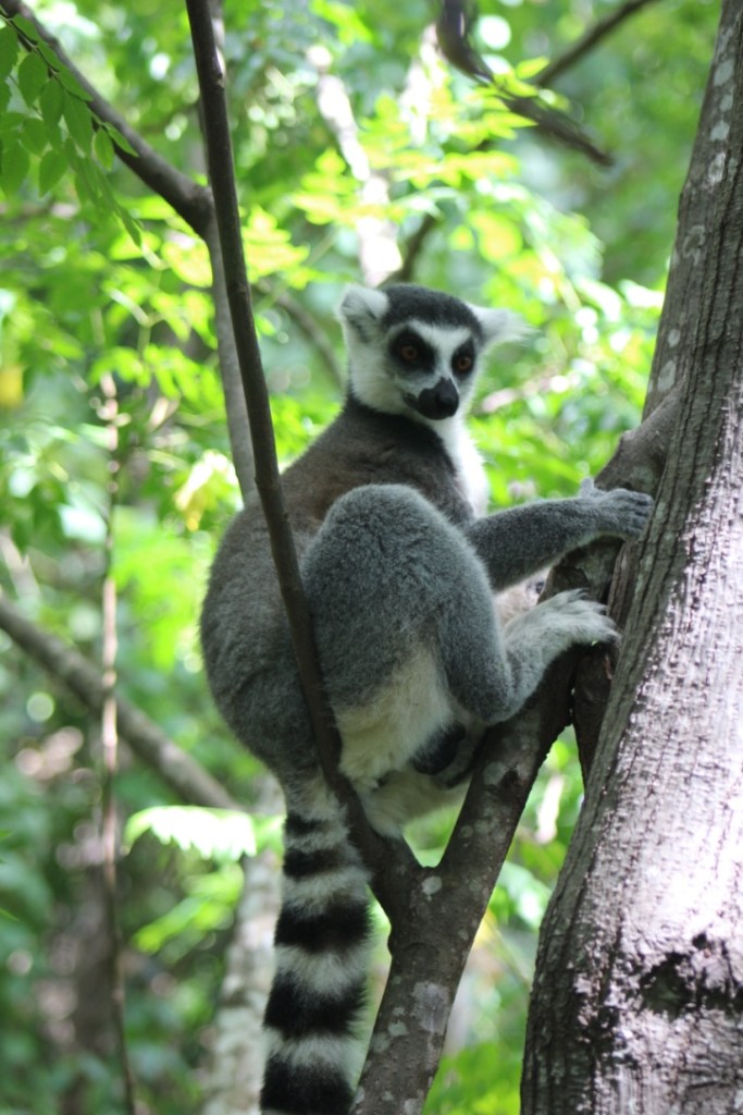The Ring-tailed lemur appeared to be quit tame and responsive to the guide’s lemur talk. He was busy munching on leaves and fruit mostly, interjected with a few flying leaps. I practiced the noises with my throat, but seldom got a response. Communicating with lemurs was definitely going to take some practise, just like any language. His fur pattern was striking, his tail striped like a zebra. I wondered how nature evolves such distinct beauty and definition.